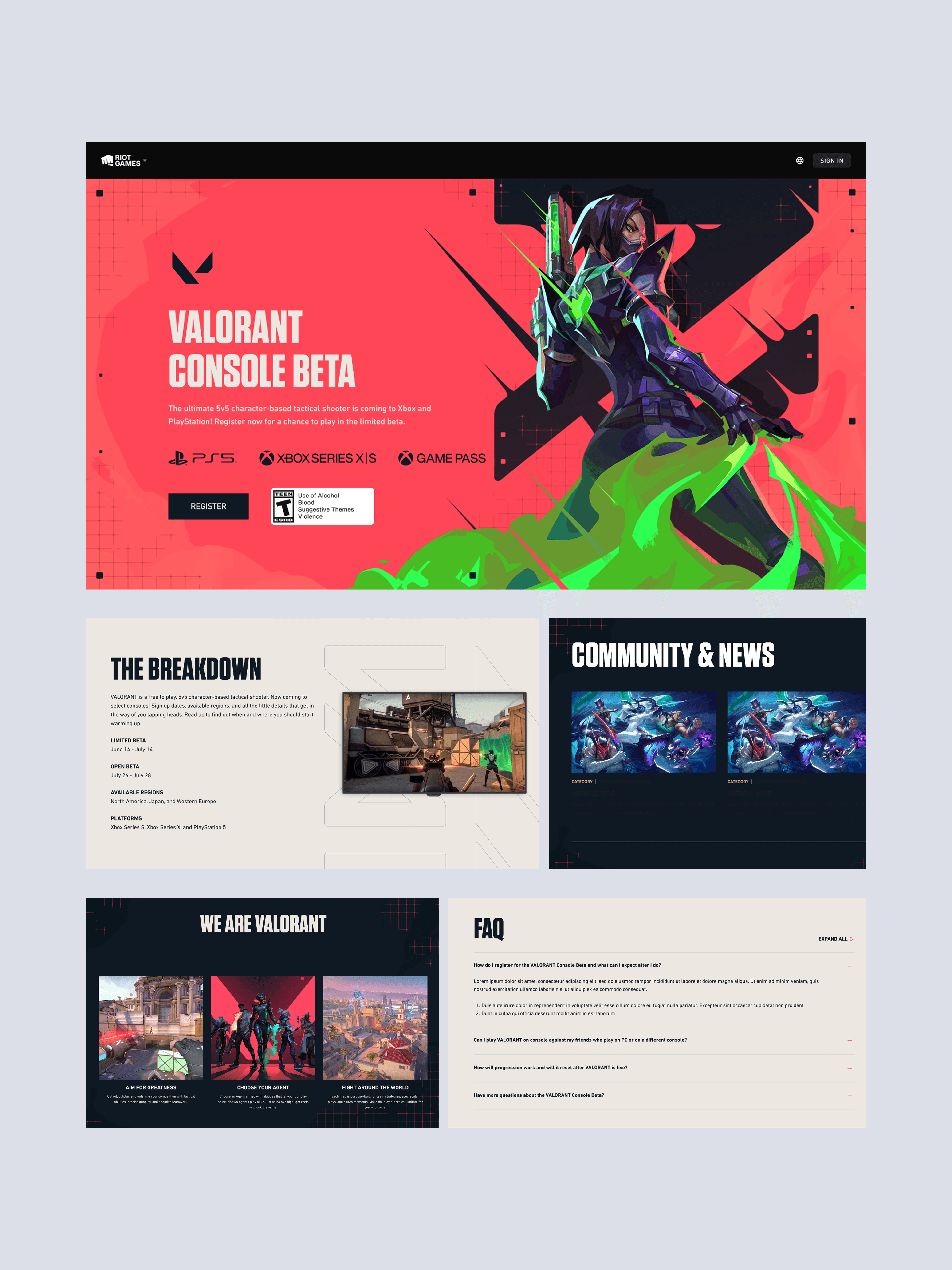Clarity around registration process and event details. Make it easy for new players to learn about the game before playing. Leverage community videos to build excitement leading up to the opening. Using a new CMS system, the same information cards existing across the experience created consistency.